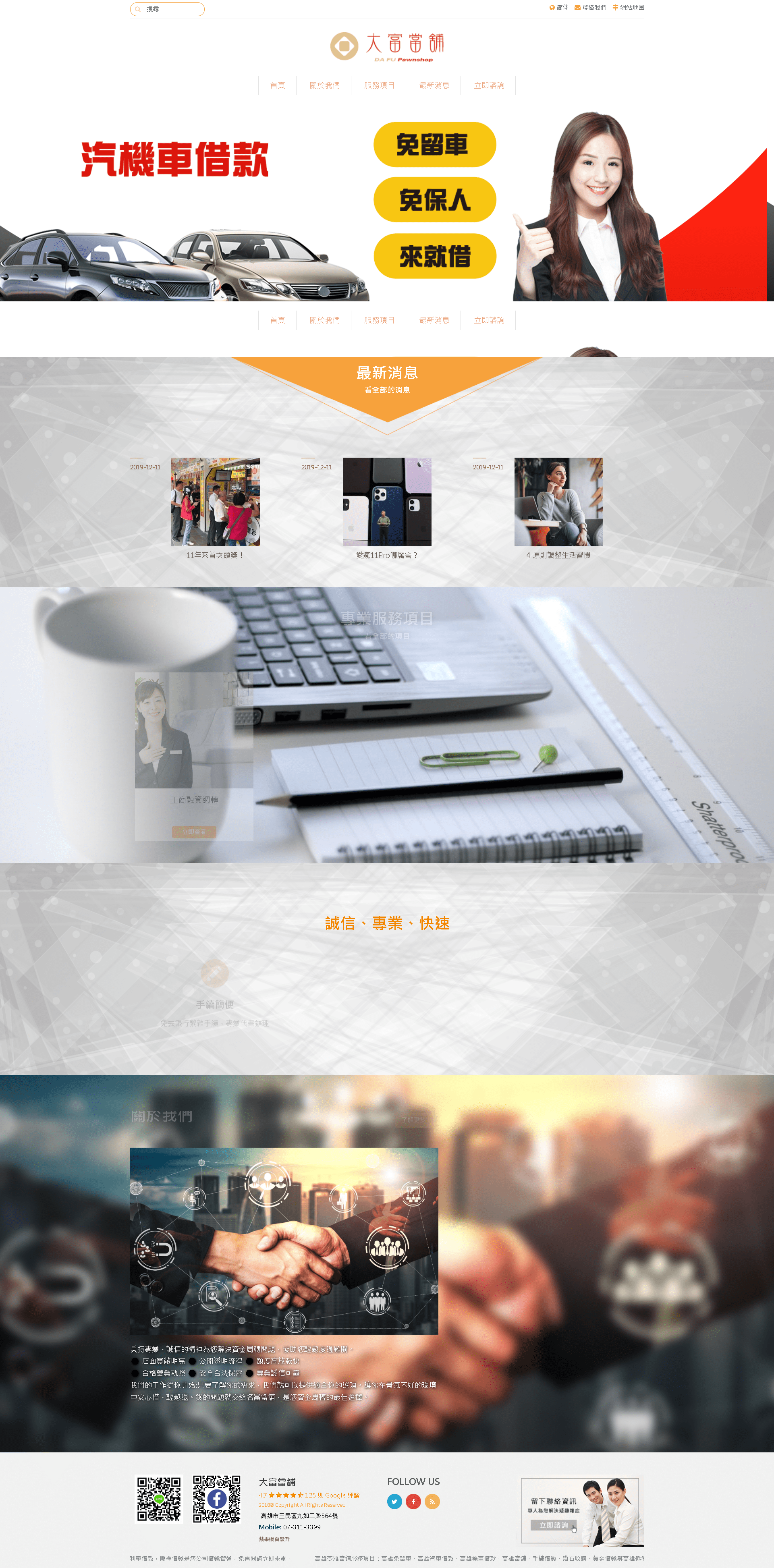 快速處理您的資金問題。汽機車借款,貸款分期車可借,免留車,各式轎車 貨車、遊覽車、工程車、重機均可貸。隨借隨有,汽機車借款,貸款分期車可借,秉持著誠信、安全、便捷、保密的原則與顧客至上的經營理念來服務廣大的客戶。